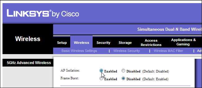Зазвичай ви знайдете цю опцію в розширених налаштуваннях бездротового зв’язку. Наприклад, на певних маршрутизаторах Linksys ви знайдете його в розділі Бездротовий зв'язок> Додаткові параметри бездротового зв'язку> Ізоляція точки доступу.