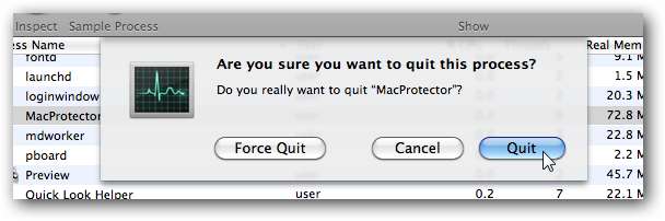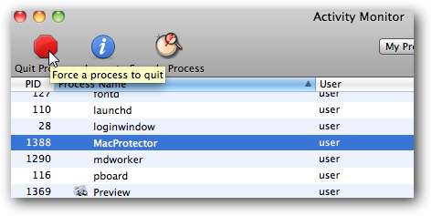 Тепер перейдіть до жорсткого диска -> Програми -> Службові програми та відкрийте монітор активності. Знайдіть процес MacProtector і натисніть процес виходу.