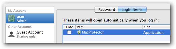 Виберіть свого користувача зліва, а потім перейдіть на вкладку елементи входу. Виберіть запис MacProtector, а потім натисніть кнопку мінус (-) внизу вікна.