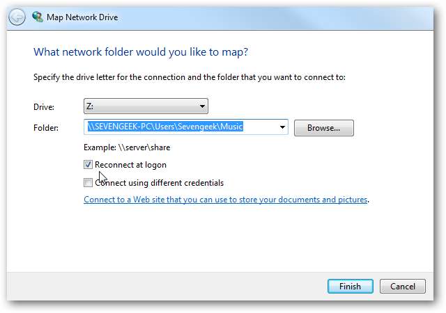 Тепер надайте йому доступну букву диска, введіть шлях або перейдіть до папки, до якої потрібно зіставити. Поставте прапорець біля Знову підключіться під час входу якщо ви хочете, щоб він був доступний після перезавантаження, і натисніть кнопку Готово.