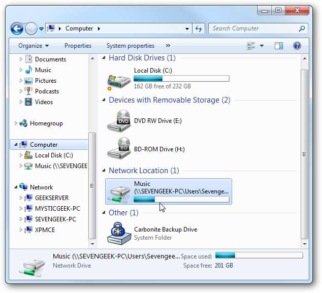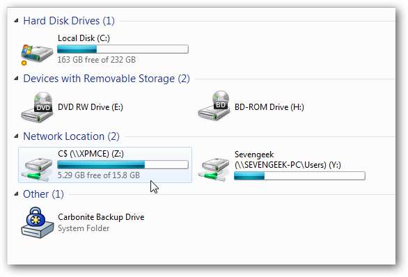 Тут ви бачите, що у нас є два відображені накопичувачі. Одна до іншої машини Windows 7 у мережі, а інша - до комп’ютера XP.
