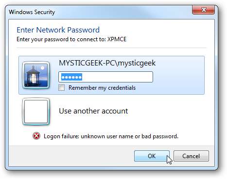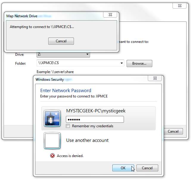 Тут ми розглянемо проблему, з якою ви зіткнетеся при спробі зіставлення з машиною XP, якщо все буде налаштовано неправильно. Якщо ви спробуєте перейти на свій апарат XP, ви побачите повідомлення про те, що у вас немає дозволу.