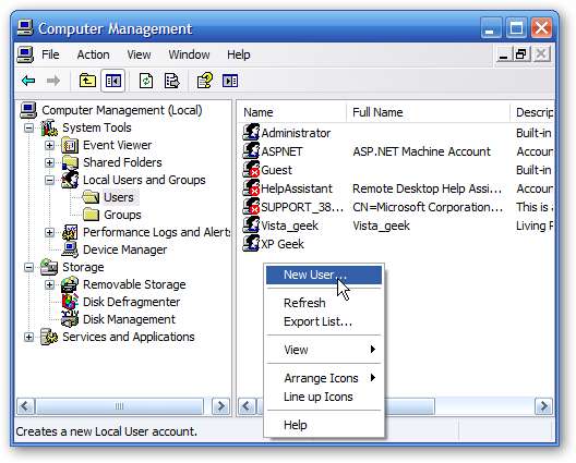 У розділі Керування комп’ютером розгорніть «Локальні користувачі та групи» та натисніть папку «Користувачі». Клацніть правою кнопкою миші порожню область та натисніть Новий користувач .