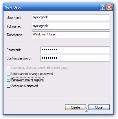 Додайте облікові дані користувача, зніміть прапорець Користувач повинен змінити пароль при наступному вході в систему , потім перевірте Пароль ніколи не закінчується потім натисніть Створити.