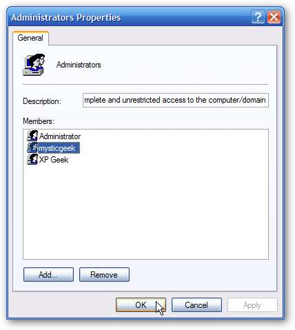 Тепер ви бачите користувача як члена групи адміністраторів ... клацніть Ok.
