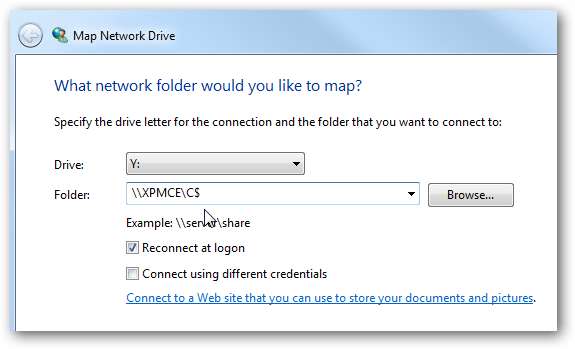 Тепер ми можемо зіставити карту на весь диск. Введіть шлях до диска, де в цьому прикладі це "\\ XPMCE \ C $" - Не забудьте знак "$" після букви локального диска.