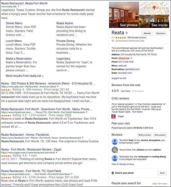 Незважаючи на це, цінність гучних та принаймні теоретично неупереджених оглядів очевидна. Деякі дрібні підприємства в технічно підкованих міських центрах можуть жити і померти за своїми показниками Yelp, навіть після багатьох років публічних суперечок. Зараз пошукові системи, такі як Google, почали інтегрувати як власні огляди (у цьому випадку через систему огляду Google Maps), так і сторонні платформи в пошукові системи. Зауважте: веб-пошук популярного ресторану Форт-Ворт включає п’ятизіркові рейтинги від Google Maps, TripAdvisor, Yelp, Zagat та Open Table, що добре видно на першій сторінці.