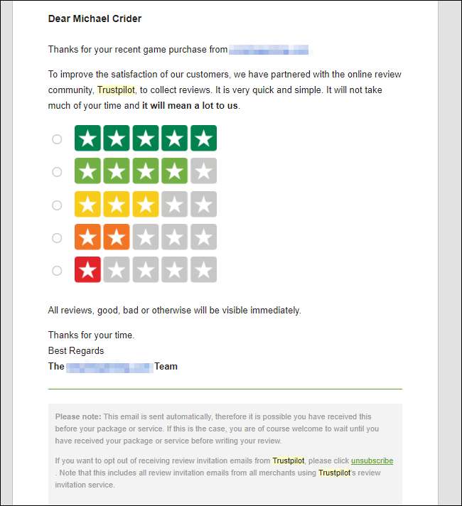 Чудовий приклад трапився зі мною кілька тижнів тому. Я придбав код гри Steam у продавця на eBay - нічого особливо незвичного чи цікавого, і я отримав те, за що заплатив, без жодних видань. Але після завершення транзакції я отримав електронний лист із проханням переглянути послугу постачальника.