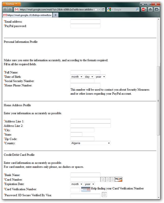 Прокручуючи трохи далі, ви бачите, що ця форма вимагає не лише інформацію про вхід в систему PayPal, але й інформацію про банки та кредитні картки. Частина зображень зламана.