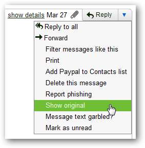 Далі ми розглянемо необроблені заголовки повідомлень електронної пошти. Gmail робить це доступним за допомогою опції меню Показати оригінал у повідомленні.