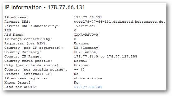 IP-адреса “Користувач” - це оригінальний відправник. Швидко шукаючи інформацію про IP, ми можемо побачити, що IP-адреса, що надсилається, знаходиться в Німеччині.