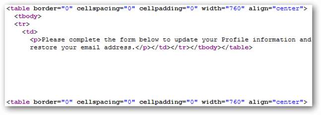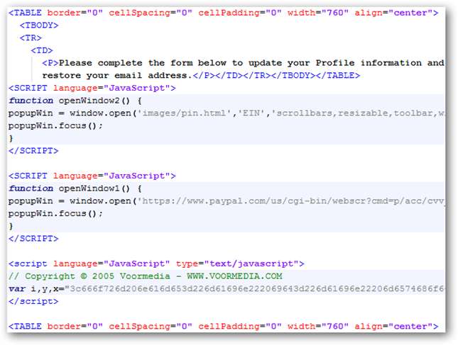 Щоб побачити це, нам слід спочатку зберегти вкладення HTM, зробити наш робочий стіл і відкрити в текстовому редакторі. Прокручуючи його, здається, все в порядку, крім випадків, коли ми потрапляємо до підозріло виглядаючого блоку Javascript.