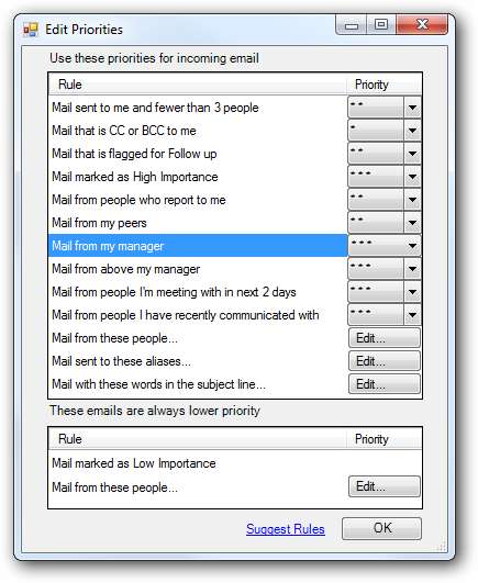 Коли ви переживаєте напружений робочий день, ніщо не дратує, ніж отримання тонн електронної пошти, коли ви намагаєтеся щось зробити. Пріоритет електронної пошти - це зручна розетка, яка дозволить вам поставити знак "Не турбувати" у свою поштову скриньку, призупиняючи нові вхідні повідомлення. Це також дозволяє визначити пріоритети електронної пошти через систему оцінок 0-3 зірки, яку ви можете налаштувати. Для цього потрібен Outlook 2007, який працює на сервері Exchange Server, тому ідеально підходить для використання в офісі і не призначений для домашніх користувачів.