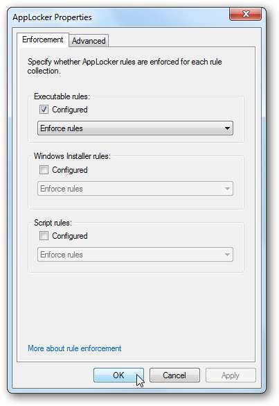 Тепер у розділі Властивості AppLocker встановіть прапорці біля Налаштовано у розділі Виконавчі правила натисніть кнопку Ok.