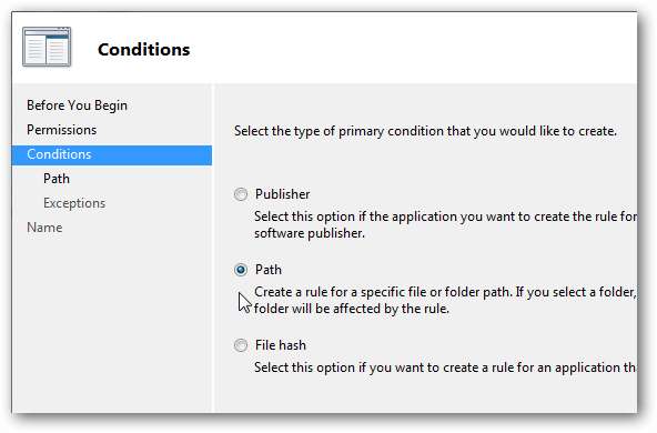 В Умовах ви можете вибрати хеш видавця, шляху або файлу. Ми не хочемо, щоб Джек мав доступ до жодної з ігор. тож ми виберемо Шлях.