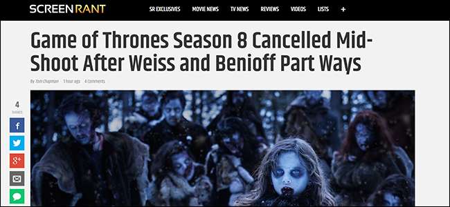 Почніть з роздумів про те, що ви хочете сказати про фальшивий заголовок. Я вирішив створити такий, який стверджує, що наступний сезон "Ігри престолів" скасовано в середині зйомок, оскільки творці випали. Коли ви визначитеся зі своїм кутом зору, вам потрібно продумати веб-сайт, який би став надійним джерелом новин.