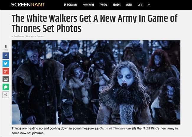 З моїм кутом гри престолів я вирішив використовувати Screenrant. Ця стаття про деякі нові фотографії бездоганна тому що основне зображення - це саме те зображення, яке було б використано у статті про скасовуване шоу. Ви хочете спробувати знайти на веб-сайті, який ви використовуєте, статтю, яка також має хороший провідний образ.