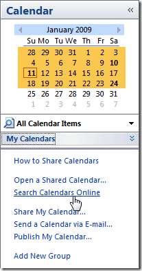 Спочатку відкрийте Календар і в навігаційній області натисніть на Пошук календарів в Інтернеті посилання.