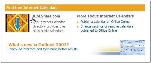 Це відкриє Microsoft Office Outlook сторінку, де ми можемо дізнатись більше про онлайн-календарі або просто перейти на iCALShare.com і виберіть кілька цікавих веселих календарів для наслідування.