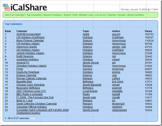 На сайті iCALShare є чимало календарів, що охоплюють багато різних тем, на які потрібно підписатися. Якщо ви не бачите, що вас цікавить, можете подайте своє .