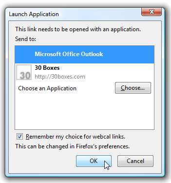 Якщо ви використовуєте Firefox, ви отримаєте поле Запустити програму з проханням вибрати програму, де за замовчуванням вибрано Outlook. Поставте чек біля "Запам’ятай мій вибір .." і це буде єдиний раз, коли доведеться робити вибір.