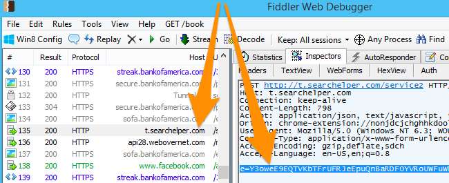 Fiddler - це веб-інструмент налагодження, який діє як проксі-сервер та кешує всі запити, щоб ви могли бачити, що відбувається. Це інструмент, який ми використовували - якщо ви хочете дублювати копію вдома, просто встановіть одне з таких шпигунських розширень, як Hover Zoom, і ви почнете бачити два запити на сайти, подібні до t.searchelper.com та api28.webovernet.com для кожної сторінки, яку ви переглядаєте. Якщо ви позначите тег Inspectors, ви побачите купу закодованого тексту base64 ... насправді, він чомусь був закодований base64 двічі. (Якщо вам потрібен повний приклад тексту перед декодуванням, ми зберігаємо його у текстовому файлі тут).