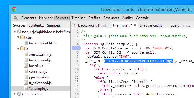 Щойно ви натиснете, щоб перевірити, ви одразу побачите список вихідних файлів та всілякі інші речі, які, ймовірно, будуть для вас грецькими. У цьому випадку найважливішими є два файли з іменами tr_advanced.js та tr_simple.js. Вони містять код відстеження, і можна з упевненістю сказати, що якщо ви бачите ці файли всередині будь-якого розширення, вас підглядають або в якийсь момент підглянуть. Звичайно, деякі розширення містять інший код відстеження, тому те, що у вашого розширення їх немає, нічого не означає. Шахраї, як правило, хитрі.