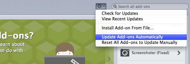 Для Firefox процес набагато простіший. Перейдіть на екран Додатки, клацніть піктограму меню та зніміть прапорець біля пункту «Оновлювати надбудови автоматично».