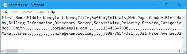 Файл CSV має досить просту структуру. Це список даних, розділених комами. Наприклад, скажімо, у вас є кілька контактів у менеджері контактів, і ви експортуєте їх як файл CSV. Ви отримаєте файл, що містить такий текст: