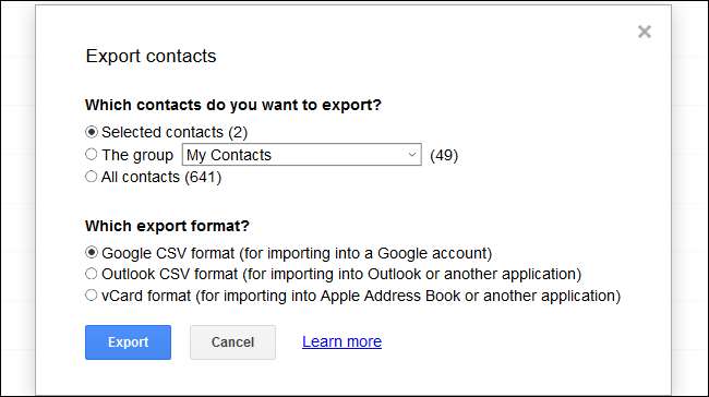 Залежно від програми, з якої ви експортуєте дані, можливо, вам доведеться вибрати відповідний формат CSV для цільової програми. Наприклад, Google Контакти можуть експортувати контакти у форматах Google CSV (для Google Contacts) або Outlook CSV (для Microsoft Outlook). У будь-якому випадку ви отримуєте файл CSV, що містить дані, але він організований дещо по-іншому.