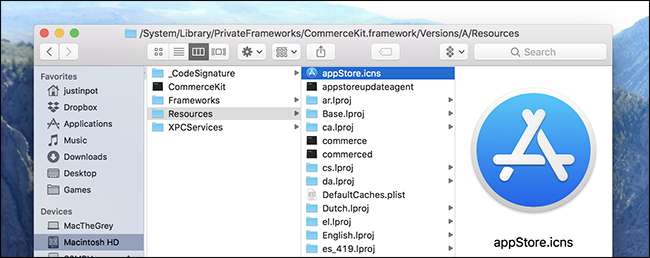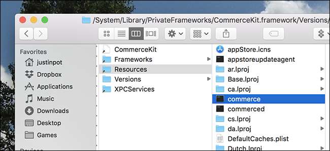 Правильно: ми розглядаємо піктограму Mac App Store. Прокрутіть униз, і ви знайдете різні сценарії, пов’язані з App Store: storedownloadd, storeinstalld тощо. Зрозуміло, що "CommerceKit.framework" включає різні речі, пов'язані з Mac App Store, а "commerce" - один із багатьох сценаріїв, які він використовує для покупки.