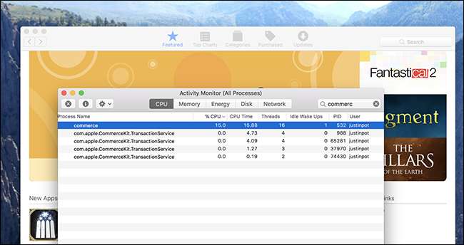 Ви можете перевірити це в Activity Monitor: просто знайдіть “commerce”. На холостому ходу це не повинно мати потужності процесора. Однак відкрийте Mac App Store, і ви побачите трохи активності.