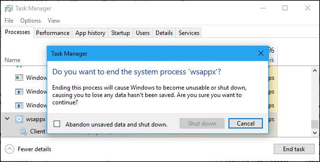 Якщо ви намагаєтеся вбити процес wsappx із диспетчера завдань, Windows попереджає вас, що ваша система стане непридатною для використання або вимкнеться. Також немає можливості примусово вимкнути wsappx у утиліта Services .