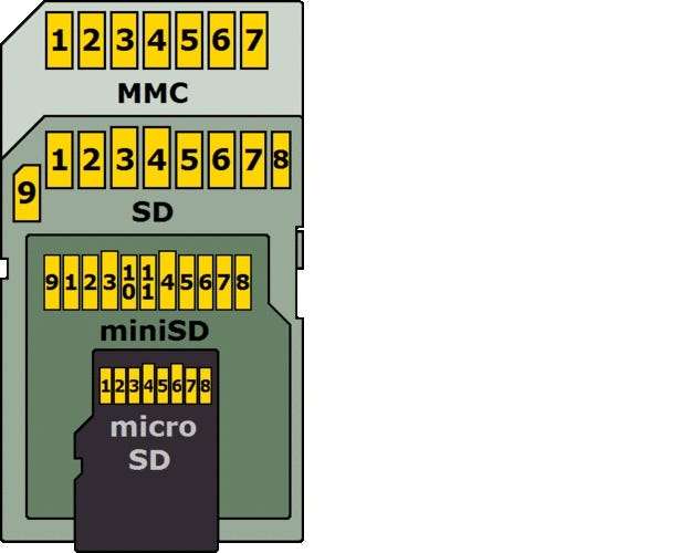 Восьмий і дев'ятий контакти були додані до формату MMC при створенні повноформатного формату SD. Там не було місця для восьми повнорозмірних контактів (підтримуючи зворотну сумісність), і, можливо, вони навчились дещо про застосування та відключення живлення спочатку між реалізацією форматів MMC та SD (або про здешевлення без додаткового перемикача, якщо вони розширив контакти).