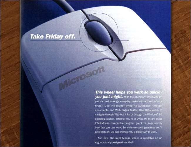 Scrollbars є зручними і досі використовуються сьогодні, але акт пошуку прокрутки на екрані, а потім натиснувши свої стрілки або натиснувши та перетягнувши бару, сповільнювалися речі. Ось чому інтелігент відчував себе таким великим одкровенням. Вона включала колесо, яке, коли обертається, дозвольте легко прокручувати текст. Насправді, у своєму Початковий прес-реліз IntelliMouse , Microsoft пише, "IntelliMouce усуває необхідність використання смуг прокрутки".