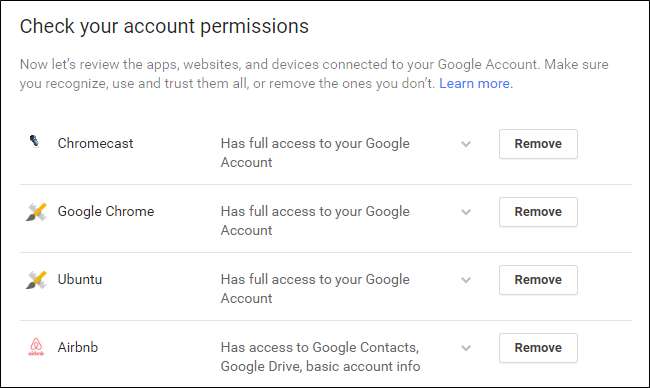 اگلا سیکشن دوسرا اہم حصہ ہے: اکاؤنٹ کی اجازت۔ بنیادی طور پر ، یہ وہ چیز ہے جس میں آپ کے Google اکاؤنٹ تک رسائی ہے. جو کچھ بھی آپ نے Gmail کے ساتھ لاگ ان کیا ہے یا بصورت دیگر اپنے اکاؤنٹ سے اجازت دے دی ہے۔ فہرست میں نہ صرف یہ دکھایا جا. گا کہ ایپ یا آلہ کیا ہے ، بلکہ اس تک جس کی رسائی ہے۔ اگر آپ کو کسی چیز تک رسائی دینا یاد نہیں ہے (یا ابھی زیر التواء ایپ / ڈیوائس کا استعمال نہیں کریں گے) ، تو پھر اس کے اکاؤنٹ تک رسائی منسوخ کرنے کے لئے "ہٹائیں" بٹن پر کلک کریں۔ اگر یہ وہ اکاؤنٹ ہے جس کو آپ واقعتا use استعمال کرتے ہیں اور اتفاقی طور پر اسے ہٹا دیتے ہیں تو ، آپ کو اگلی بار لاگ ان کرنے پر اسے دوبارہ گنجائش دینی ہوگی۔
