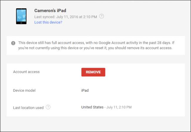 اگلے حصے میں کچھ وقت لگ سکتا ہے یا نہیں ، اس پر منحصر ہے کہ آپ نے کتنے آلات سے رابطہ قائم کیا ہے۔ یہ وہ جگہ ہے ضرور تاہم ، جس چیز پر آپ دھیان دینا چاہیں گے ، تاہم: اگر اب آپ کے پاس کوئی خاص آلہ موجود نہیں ہے یا استعمال نہیں ہوتا ہے تو ، اس کے پاس اپنے اکاؤنٹ تک رسائی کی کوئی وجہ نہیں ہوگی! یہ بات بھی قابل دید ہے کہ اگر آپ نے حال ہی میں نیم آلہ استعمال کیا ہے تو ، وقت ، تاریخ اور مقام نام کے ساتھ دکھائے جائیں گے۔ مخصوص آلات کے بارے میں مزید معلومات حاصل کرنے کے لئے ، لائن کے آخر میں نیچے والے تیر پر کلک کریں۔