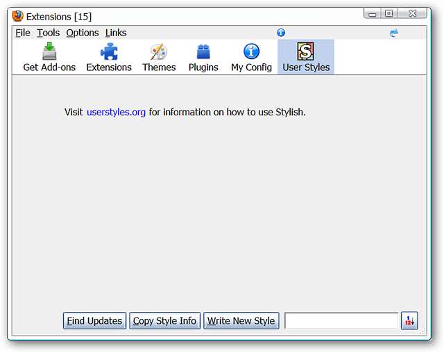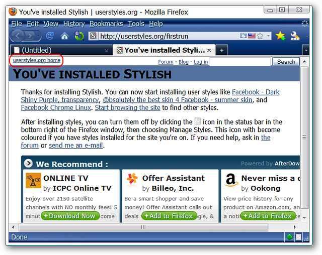 ایکسٹینشن انسٹال کرنے کے بعد آپ کو پہلے رن پیج کے ساتھ پیش کیا جائے گا۔ آپ اسے کھلا رکھنے کے خواہاں ہوسکتے ہیں تاکہ آپ اوپری بائیں کونے میں موجود لنک کو استعمال کرتے ہوئے UseStyles.org ویب سائٹ کو براہ راست براؤز کرسکیں۔