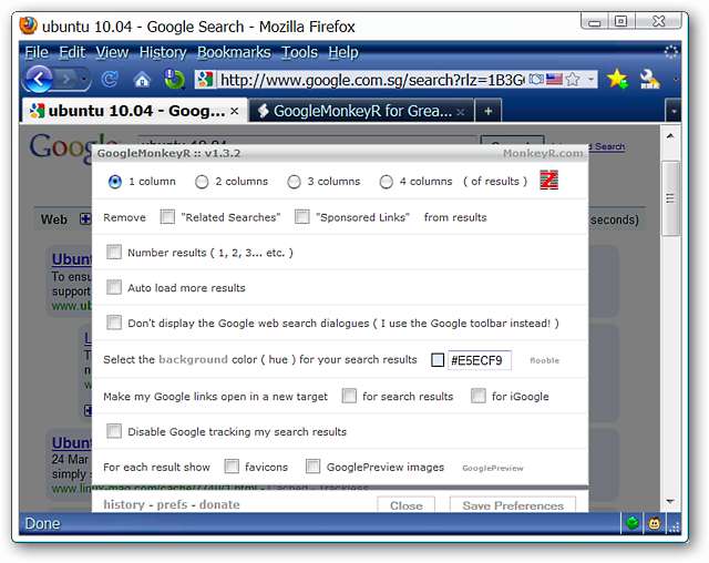 ایک بار جب آپ GoogleMonkeyR کی ترجیحات پر کلیک کریں گے تو سرچ پیج شیڈ ہوجائے گا اور آپ کو صارف اسکرپٹ کی ترجیحات تک رسائی حاصل ہوگی۔ یہ وہ جگہ ہے جہاں آپ واقعی اپنے تلاش کے نتائج کو منفرد رنگا رنگ بنا سکتے ہو!