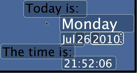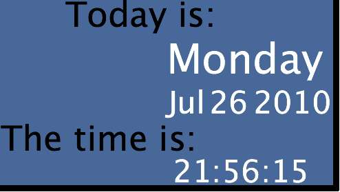 جامد نصوص کے لئے ، آج ہے: اور وقت ہو رہا ہے: ، آپ اوور رائڈ ٹیکسٹ سیکشن کا استعمال کریں گے۔ فونٹ شیلیوں کو تبدیل کرنے کے لئے فونٹ اور رنگ متعین کرنے کے لئے یہاں کلک کریں . اس مثال کے طور پر ، ہم ہفتہ کے دن کے علاوہ جو ہر ایک کے 50 کے حساب سے 45 کے سائز کے فونٹ کے ساتھ ، کالے اور سفید ، پہلے سے طے شدہ فونٹ چہرے کا استعمال کر رہے ہیں۔
