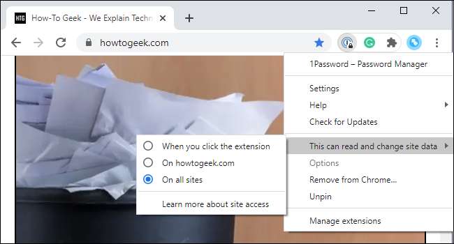 میں گوگل کروم اور مائیکروسافٹ ایج، آپ کر سکتے ہیں ایک توسیع کی "سائٹ تک رسائی" اجازتیں کو کنٹرول اور یہ آپ کو کھولنے کے تمام ویب سائٹس پر خود کار طریقے سے چلتا ہے کہ آیا کو منتخب کریں، صرف آپ اس پر کلک کریں، یا صرف مخصوص ویب سائٹس پر آپ کی فہرست پر جب.