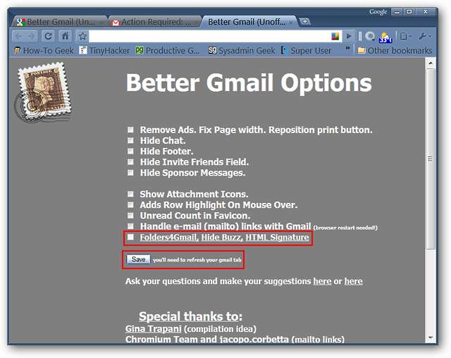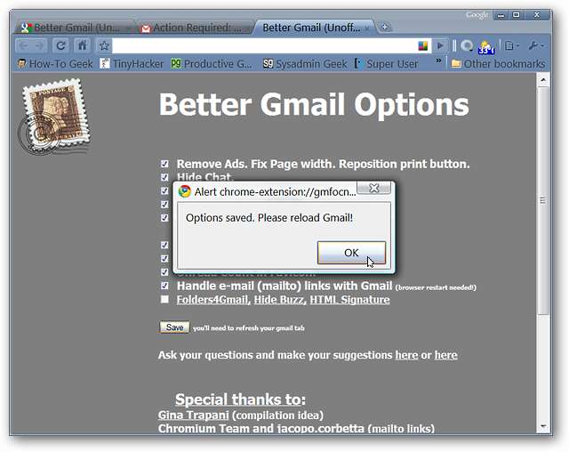 جیسے ہی آپ نے بہتر جی میل انسٹال کیا ہے ایک نیا ٹیب خود بخود کھل جائے گا اور آپ کو دستیاب اختیارات کے ساتھ پیش کرے گا۔ ہر ایک آپشن کے ل the باکس میں "چیک مارک" رکھیں جو آپ کو چالو کرنا چاہیں گے اور ختم ہونے پر "محفوظ کریں" پر کلک کریں۔
