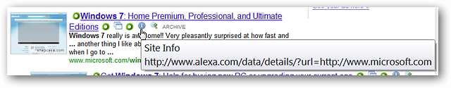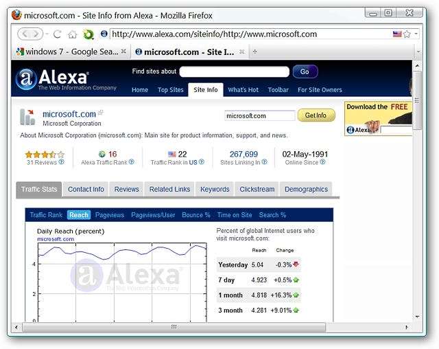 "سائٹ کی معلومات" پر کلک کرنے سے ایک نئے ٹیب میں تلاش کے نتائج کے بارے میں معلومات والا ایک "الیکسا پیج" کھل جائے گا۔