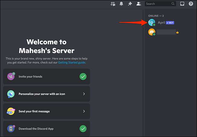 اس بات کی تصدیق کرنے کے لئے کہ بوٹ واقعی آپ کے سرور میں شامل کیا جاتا ہے، آپ کے سرور کو ڈسپلے پر رسائی حاصل ہے. سرور اسکرین کے حق میں، آپ کو صارف کی فہرست میں آپ کے نئے اضافی بوٹ مل جائے گا. یہ تصدیق کرتا ہے کہ بوٹ کامیابی سے شامل کیا گیا تھا.