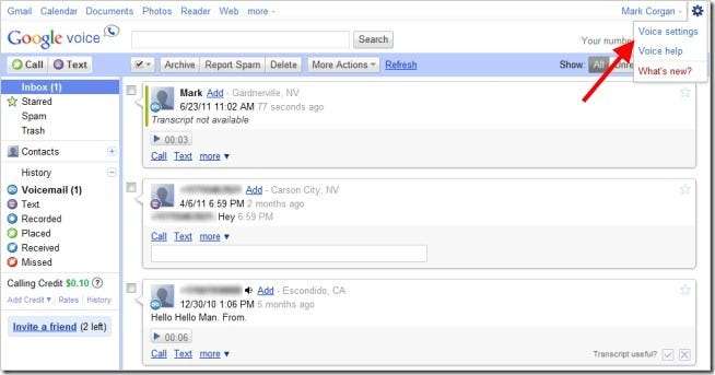 اپنے گوگل وائس اکاؤنٹ میں لاگ ان کریں اور اوپر دائیں کونے میں گیئر آئیکن پر کلک کریں۔ "صوتی ترتیبات" مینو آئٹم پر کلک کریں۔