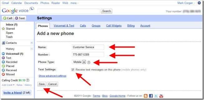 نام ، نمبر اور فون کی قسم کی معلومات پُر کریں۔ منتخب کریں کہ آیا آپ مخصوص نمبر پر ٹیکسٹ پیغامات وصول کرنا چاہتے ہیں اگر آپ "موبائل" کو بطور فون ٹائپ منتخب کرتے ہیں۔ اپنی ترتیبات کو بچانے کے لئے "محفوظ کریں" کے بٹن پر کلک کریں اور "فون" ٹیب پر واپس جائیں۔
