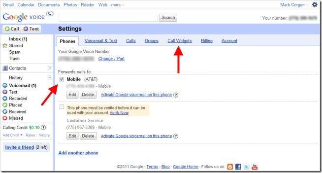اس فون نمبر کے ساتھ والے چیک باکس پر کلک کریں جس پر آپ چاہتے ہیں کہ کال ویجیٹ آپ کو کال کرے۔ اگر آپ اپنا گوگل وائس نمبر استعمال کرنا چاہتے ہیں تو کوئی نمبر نہ چیک کریں۔ جب آپ نے نمبر منتخب کیا ہے تو "کال وجیٹس" کے ٹیب پر کلک کریں۔