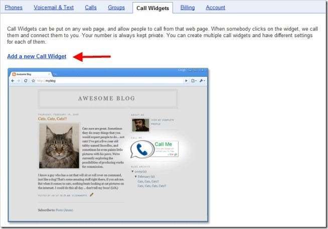 اپنی ویب سائٹ یا بلاگ میں گوگل کال ویجیٹ شامل کرنے سے زائرین کو اپنا گوگل وائس نمبر استعمال کرکے آپ سے رابطہ کرنے کی اجازت ملتی ہے۔ ویجیٹ کسٹمر کو آپ کی اصل تعداد جاننے کے بغیر براہ راست کسٹمر سپورٹ فراہم کرنے کا ایک آسان اور سستا طریقہ فراہم کرتا ہے۔