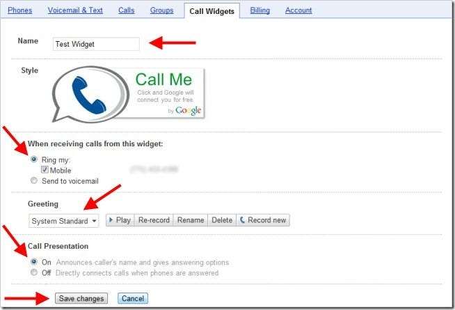 نام کے میدان میں پُر کریں ، منتخب کریں کہ آپ کس طرح کال موصول ہونا چاہتے ہیں ، کسی مبارکباد کی قسم کو منتخب کریں یا کوئی ریکارڈ کریں اور جب کال ویجیٹ کسٹمر سے جڑ جاتا ہے تو آپ کس طرح کال پیش کرنا چاہتے ہیں اس کا انتخاب کریں۔ کال ویجیٹ کی ترتیبات کو بچانے کیلئے "تبدیلیاں محفوظ کریں" کے بٹن پر کلک کریں۔