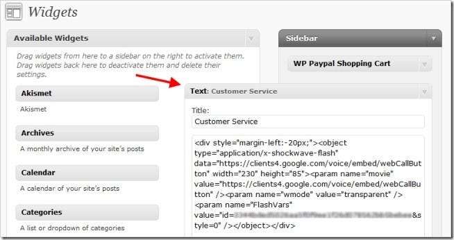 زیادہ تر بلاگنگ فراہم کنندگان کو یہ صلاحیت ملتی ہے کہ وہ اپنے بلاگس جیسے کسی HTML یا متن ویجیٹ میں وجیٹس کو شامل کرسکیں۔ اگر آپ اپنے بلاگ میں کال ویجیٹ شامل کرنا چاہتے ہیں تو ، HTML یا ٹیکسٹ ویجیٹ کا استعمال کریں اور کوڈ کو ویجیٹ میں چسپاں کریں۔ پیج کو محفوظ کریں اور دیکھیں۔ یہاں ورڈپریس کا استعمال کرتے ہوئے ایک مثال ہے۔